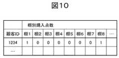 購入金額データベース122に格納されるデータについては、図9で後述する。購入金額122は来店顧客毎に棚別の購入金額を集計したものである。購入金額は、商品毎の価格の差を無視したければ購入点数としてもよい。この場合のデータについては図10で後述する。