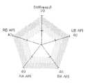 図6は、パラメータとして硬化パラメータであるStiffnessβ、API(RB、LB、RA、LA)が設定された場合の硬化系レーダチャートを示す図である。この例では、パラメータと位置情報とから全体のパラメータ数は5であり、正5角形に表示と決定される。なお、硬化パラメータであるStiffnessβの計測を行うためには、図1の実施例の構成に加えて、頸動脈の血管径を計測する超音波エコーセンサ、超音波送受信部、超音波制御処理部などが具備される。 FIG. 6 is a diagram showing a curing system radar chart when Stiffness β and API (RB, LB, RA, LA) that are curing parameters are set as parameters. In this example, the total number of parameters is 5 based on the parameters and position information, and display is determined to be a regular pentagon. In order to measure the stiffness parameter Stiffness β, in addition to the configuration of the embodiment of FIG. 1, an ultrasonic echo sensor, an ultrasonic transmission / reception unit, an ultrasonic control processing unit, etc. for measuring the diameter of the carotid artery Is provided.