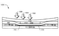 図12には、力コンセントレータ層1102の複数の異なる位置に加えられた圧力によって、可撓性コンタクト層502をセンサ基板504に接触させるような、図11の感圧キーの例1200が示されている。圧力が、矢印を使用することによって再び示されており、この例では、第1、第2及び第3の位置1202,1204,1206を含んでおり、これらの位置は、キーのエッジ、例えばスペーサ層508,508によって規定されたエッジにそれぞれより近接して所定距離に位置決めされている。  FIG. 12 illustrates the pressure sensitive key example 1200 of FIG. 11 such that the pressure applied to a plurality of different locations on the