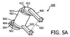 図5A〜図5Dを参照すると、別の実施形態による内視鏡ポートまたは他の手術用デバイスのための位置決めおよび向き合せ装置500が示されている。図5Aは装置500の斜視図を示す。図5Bは装置500の上面図を示す。図5Cは装置500の側面図を示す。図5Dは装置500の背面図を示す。装置500は、4つのリニア・ステージ、つまり円筒形支持体402の上部に接続されたXステージ412およびYステージ414、ならびに円筒形支持体402のベース404に接続されたXステージ506およびYステージ504を備える。円筒形支持体402の下部において、そのような目的にために、ベース502を、被検者の身体または取り付け機構(図示せず)に接続する。  With reference to FIGS. 5A-5D, a positioning and