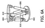図6A〜図6Cを参照すると、別の実施形態は、スチュワート・プラットフォーム組立体600を含むことができ、スチュワート・プラットフォーム組立体600は、3自由度(DOF)のプラットフォームの運動学を与える。組立体600は、ベースプラットフォーム602を備えており、ベースプラットフォーム602を、被検者への取り付けのために被検者の身体または取り付け機構(図示せず)に接続する。上側プラットフォーム604は、複数のアクチュエータ606、好ましくはリニア・アクチュエータによってベースプラットフォーム602に結合される。アクチュエータ606は、ペアでグループ化できると共に、「V」形状構成を有することができる。アクチュエータ606は、手動で作動させることができ、またはアクチュエータ606は、油圧シリンダまたは空気圧シリンダ、電気機械機構などを備えることができる。アクチュエータ606は、プラットフォーム602とプラットフォーム604の間および各アクチュエータ606の間に位置するツールチャネルの回転を可能にするように制御することができる。ベースプラットフォーム604の一部は、回転中心に貫通穴610を含むことができ、貫通穴610は、ポート入口点と位置合わせすることができる。上側プラットフォーム604の同様の一部は、ツールチャネルの通過を可能にするために貫通穴612を含むことができる。穴610および612は、穴610および612の種々の構成において位置合わせを可能にするために球面継手を有することができる。  Referring to FIGS. 6A-6C, another embodiment may include a Stewart platform assembly 600 that provides a three-degree-of-freedom (DOF) platform kinematics. The assembly 600 includes a