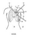 図1を参照すると、低侵襲心臓手術用の構成10が、例示的に示されている。この例では、内視鏡12ならびに2つの器具14および16が、小さいポート15を介して体腔20内に肋骨18を通じて挿入される。この小さいポート15は、約5mmと約100mmの間のサイズを含むことができる。実際の臨床では、ポート15は、職能団体、病院、または手術用機器の製造業者によって発行されたガイドラインを用いて選択される。このガイドラインは、解剖学的ランドマーク、例えば、肋骨、胸骨、乳頭、これらの特徴間の距離、およびこれらの特徴からの距離などに対して入口点を定める。しかし、一般に、この種のガイダンスは、解剖学的構造、患者のサイズ、患者の病気の特殊性などのばらつきを含んでいない。したがって、アクセスに関連した組織損傷および手術時間を最小にすると共に結果を改善するより多くの患者特有のポートの配置が有益であり得る。  Referring to FIG. 1, a minimally invasive