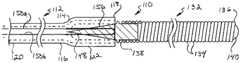 第二実施形態では、本発明は、図9〜16に示すように、患者の脈管構造内の処置部位に塞栓コイルを送達するための脱離システム110を提供する。この脱離システムは、治療用塞栓コイルの放出及び配置のための遠位部118を有する可撓性ポリマーチューブ116から形成された遠位部114と、近位部120と、を有する細長い可撓性プッシャー部材112を備える。可撓性ポリマーチューブの遠位部は、内側筒状壁面124と外側筒状壁面126とを有する筒状壁122を有し、切り込み線128は、後述するように、発熱体が位置する領域内にある可撓性遠位ポリマーチューブの遠位部の外側表面において形成される。可撓性ポリマーチューブの筒状壁は第一厚さを有し、切り込み線が形成される筒状壁の部分又は複数の部分は、第一厚さよりも小さい第二厚さを有する。典型的には、切り込み線は、レーザーで又は機械的に(1つ以上の表層切削で筒状壁を刻むことによるといったように)作製することができるが、切り込み線はまたエッチング、成形又は任意の他の好適な方法により形成されてもよく、筒状壁が拡大されると筒状壁がそれに沿って分離する薄い又は別の方法で弱められた線を形成するように筒状壁を部分的に通って又は完全に通って伸びる穿孔の1つ以上の列により形成されてもよい。可撓性ポリマーチューブの筒状壁は、可撓性ポリマーチューブの遠位部と近位部の間の細長い可撓性ポリマーチューブを通って伸びる内腔130を画定する。  In a second embodiment, the present invention provides a