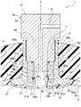 特許請求の範囲の「露出部」とは、基部122及び中間部123で構成される部位である。埋設部124は、円筒状を呈し、中間部123の先端面に形成されている。埋設部124の厚さは、中間部123の厚さよりも小さくなっている。埋設部124の内径は、中間部123の内径よりも大きくなっている。埋設部124の径方向外側、内側及び先端は、立上り部111及び折返し部112によって周方向に亘って連続して覆われている。  The “exposed part” in the claims is a part constituted by the