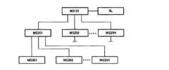 図1は、本実施形態の階層的マスタノードの構造を示している。同図に示すように、上位マスタノード(MS101)の下に階層的に下位マスタノード(MS201,MS202・・・MS20nや、MS301,MS302・・・MS30n)を有するノード構成となっている。各ノード(情報処理装置)にはデータベースを有している。また上位マスタノード(MS101)にはスレーブを有しているが、他の下位マスタノードにもスレーブを有していてもよい。このようなマスタ・スレーブ構成の場合には両者間のデータベースの更新には本出願人によるPCT/JP2010/054311(本出願人による特許文献2に係る先行出願)に記載された更新管理技術を適用することができる。  FIG. 1 shows the structure of the hierarchical master node of this embodiment. As shown in the figure, the node configuration has hierarchically lower master nodes (MS201, MS202... MS20n, MS301, MS302... MS30n) below the upper master node (MS101). Each node (information processing apparatus) has a database. The upper master node (MS101) has a slave, but other lower master nodes may have slaves. In the case of such a master / slave configuration, the update management technology described in PCT / JP2010 / 054311 by the present applicant (prior application related to