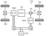 モータMG1は、例えば同期発電電動機として構成されており、上述したように、回転子がプラネタリギヤ30のサンギヤに接続されている。モータMG2は、例えば同期発電電動機として構成されており、回転子が駆動軸36に接続されている。インバータ41,42は、電力ライン54を介してバッテリ50と接続されている。モータMG1,MG2は、モータ用電子制御ユニット(以下、「モータECU」という)40によって、インバータ41,42の図示しない複数のスイッチング素子がスイッチング制御されることにより、回転駆動される。  The motor MG1 is configured as, for example, a synchronous generator motor, and the rotor is connected to the sun gear of the