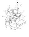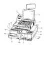 図1は、釣銭機1およびPOS端末2の外観を示す斜視図である。POS端末2は、一般に、一店舗に複数台備え付けられ、ユニークなレジナンバーを割り振られて精算場所に設けられる。キャッシャーは、売上処理にPOS端末2を用いる。POS端末2は、キーボード21、表示器22、スキャナ23(図4参照)などを備えている。  FIG. 1 is a perspective view showing the external appearance of a change machine 1 and a POS terminal 2. In general, a plurality of POS terminals 2 are installed in one store, and a unique cash register number is assigned to the POS terminal 2 at a checkout location. The cashier uses the POS terminal 2 for sales processing. The POS terminal 2 includes a