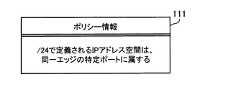 これは一例であり、ポリシー情報111には、ユーザにより任意のポリシーを登録することができる。例えば、ポリシー情報111として、“IPアドレス:192.168.100.1〜192.168.100.100は同一エッジの特定のポートに属する”、“IPアドレス:192.168.100.101〜192.168.100.200は同一エッジの特定のポートに属する”のようにIPアドレスの複数の範囲を明示的に設定してもよい。また、上記のように連続した値の範囲とする他、不連続な値(例えば、“192.168.100.101”と“192.168.100.103”など)を要素として含むIPアドレスの集合を設定することも考えられる。  This is an example, and the user can register an arbitrary policy in the