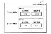 各クッキー情報には、履歴情報と識別情報とが保存されている。履歴情報はユーザのウェブサイト閲覧行動の履歴である。履歴情報には、例えば、ユーザが過去訪れたページのURLが複数保存されている。識別情報は、ユーザ或いは端末に一意に付された、ユーザ或いは端末に固有の情報である。識別情報は、例えば、“2375”等のID(符号)である。識別情報はクッキーIDと言い換えることもできる。 In each cookie information, history information and identification information are stored. The history information is a history of the user's website browsing behavior. In the history information, for example, a plurality of URLs of pages visited by the user in the past are stored. The identification information is information unique to the user or terminal and uniquely assigned to the user or terminal. The identification information is an ID (symbol) such as “2375”, for example. The identification information can also be called a cookie ID.