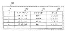 図5において、ID301はトレース結果のシーケンス番号、タイムスタンプ302はトレースした時間、プロセスID303はトレースしたプロセスID、イベント304はトレースしたプロセスIDが実行したイベントである。  In FIG. 5,