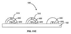 図11Cは、本発明の一実施形態に係わる、ピクセル106の概略側面図である。図11Cに示されるように、各マイクロLEDデバイス400は、青色(B)の色スペクトルを放出するように設計される。そのような実施形態では、異なる波長変換層310は、赤色(R)及び緑色(G)を放出するように設計することができる。第3の配光層320の上には、波長変換層310は形成されない。この方式で、青色発光サブピクセルからの青色光を変換することを必要とせずに、RGBサブピクセル配列が達成される。一実施形態では、第3の配光層320は、同様のマイクロレンズ特性を達成するために、波長変換層310が上に形成される他の2つの配光層320よりも、厚く作製することができる。例えば、第3の配光層320の厚さは、第1の配光層320及び第1の赤色波長変換層310(及び、あらゆる中間層)の総厚と同様のものとすることができる。  FIG. 11C is a schematic side view of