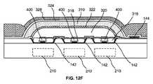 本発明の実施形態によれば、1つ以上の上部電極層318を使用することにより、サブピクセルのアレイから接地連絡線144に、マイクロLEDデバイス400の対を電気的に接続することができる。種々の冗長性及び修復構成を有する、様々な構成が可能である。明瞭性のために、図12A〜図12Eは、単一のサブピクセル内部での例示的な上部電極層318の構成に限定され、図12Fは、単一のピクセル内部での例示的な上部電極層318の構成を示す。より詳細な説明は、ピクセル区域全体にわたる様々な上部電極層の構成に関する、図15〜図19に関連して提供される。  According to embodiments of the present invention, a pair of