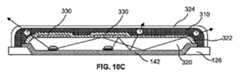次いで、図9Aに関連して上述されたように、任意選択の波長分散層320、任意選択の整合層322、波長変換層310、及び任意選択のバリア層324を形成することができる。図11A、図11Fに戻り、手短に参照すると、光透過を阻止するため、及び隣接するサブピクセルの間の光の滲みを分離するために、反射バンク層142の間に、ブラックマトリクス(又は、代替的にホワイトマトリクス)材料202が示されている。ブラック(又は、ホワイト)マトリクス202は、使用される材料、及び既に形成されている層の組成に基づいて、適切な方法により形成することができる。形成の方式はまた、ブラック(又は、ホワイト)マトリクスが、片面方式(図14Aを参照)又は上面押下方式(図14Bを参照)のいずれで形成されるかによっても、決定することができる。例えば、ブラック(又は、ホワイト)マトリクス202は、インクジェット印刷、スパッタ及びエッチング、リフトオフを使用するスピンコーティング、あるいは特定の印刷方法を使用して、適用することができる。一部の実施形態では、ブラック(又は、ホワイト)マトリクス202は、既に形成されている波長変換層110内の蛍光体粒子を、熱的に劣化させないために、インクジェット印刷及びUV硬化によって形成される。例示的なブラックマトリクス材料としては、炭素、金属膜(例えば、ニッケル、アルミニウム、モリブデン、及びそれらの合金)、金属酸化物膜(例えば、酸化クロム)、及び金属窒化物膜(例えば、窒化クロム)、有機樹脂、ガラスペースト、並びに、黒色顔料若しくは銀粒子を含む樹脂又はペーストが挙げられる。例示的なホワイトマトリクス材料としては、例えば、ポリマー、有機樹脂、若しくはガラスペースト内に充填された、金属粒子又はTiO2粒子が挙げられる。An optional