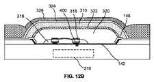 図12Aは、図7Bに示される矩形形状の反射バンク層142の、より短い幅を横断する側断面図を示し、その一方で、図12Bは、図7Bに示される矩形形状の反射バンク層142の、より短い幅に直交する、より長い幅の図である。図12A〜図12Fに示される特定の実施形態は、調整可能な色の発光スペクトルのために波長変換層と組み合わされた、冗長性及び修復スキーム内に、マイクロLEDデバイスの対を統合するための、特定の実施例を示すために提供されることを理解されたい。図示の特定の実施形態は、ライトパイプの形態の、細長ドーム形状の配光層320の上に形成された、波長変換層310を含み、この波長変換層310はまた、反射バンク層142の上に形成される。更には、図12A〜図12Fは、様々な上部電極構成を示す。しかしながら、先行の実施形態及び図で前述されたように、本発明の実施形態は、そのように限定されるものではない。したがって、本発明の実施形態は、図12A〜図12Fに示される、上部電極構成と冗長性及び修復スキームとの特定の組み合わせに限定されるものではない。  12A shows a side cross-sectional view across the shorter width of the rectangular shaped