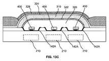 一実施形態では、一対のマイクロLEDデバイス400が、下層の回路機構210を含む基板102上、又は基板102内部の、反射バンク層142に接合される。マイクロLEDデバイス400は、前述のように、転写接合プロセス、弾性スタンプを使用する転写、あるいは静電転写ヘッドアレイを使用する転写及び接合を含めた、様々な技術を使用して、マイクロLEDデバイス400のアレイの一部として、基板102に転写及び接合することができる。この転写プロセスに続けて、図12A〜図12Fに示される不活性化層316及び上部電極層318の形成の前に、欠陥、欠落、又は汚染したマイクロLEDデバイスに関して、ディスプレイ基板102を検査することができる。この方式で、不活性化層316及び上部電極層318、並びに波長変換層の堆積パターンを潜在的に変更するために、及び必要な場合に、交換用マイクロLEDデバイスを潜在的に転写するために、欠陥、欠落、又は汚染したマイクロLEDデバイスの検出を使用することができる。  In one embodiment, a pair of
