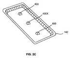 ここで図2A〜図2Dを参照すると、本発明の実施形態に係わる、サブピクセル108の反射バンク層内部に実装された、マイクロLEDデバイスの配置構成に関する等角図が提供される。図2Aは、前述のようにバンク開口部128の側壁及び底面に沿って、及びバンク開口部128に隣接するパターン形成されたバンク層126の上面に部分的に沿って形成された、反射バンク層142を示す。図2Aに示される実施形態では、一対のマイクロLEDデバイス400が、バンク開口部の長さに沿って、対向する側壁から均等に離間するように、反射バンク層142内部に実装される。したがって、図2Aは、例示的なマイクロLEDデバイス冗長スキームを例示するものである。図2Bに示される実施形態では、一対のマイクロLEDデバイス400は、更なるマイクロLEDデバイスのための余地が、修復接合部位401に存在するように、反射バンク層142内部に実装される。したがって、図2Bは、修復部位を有する、例示的なマイクロLEDデバイス冗長スキームを例示するものである。  Referring now to FIGS. 2A-2D, isometric views are provided regarding the arrangement of micro LED devices mounted within the reflective bank layer of