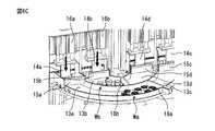 そして、ステップS12においては、選択されたプログラムに基づいて気体噴射部36が気体を噴射する。図8A〜図8Cは半径方向外側における供給経路、例えば第一供給経路13aの頂面図であり、図9A〜図9Cは半径方向内側における供給経路、例えば第二供給経路13bの頂面図である。以下、これら図面を用いて、互いに隣接した複数の物品を分散させる手法について説明する。  And in step S12, the gas injection part 36 injects gas based on the selected program. 8A to 8C are top views of the supply path on the radially outer side, for example, the