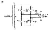 端子T1,T2間には、PFC回路210から出力される直流電圧V1が印加される。そして、スイッチング素子Q1〜Q4のスイッチング動作に伴なって、端子T3,T4間に出力電圧Vo及び出力電流Ioが生じる(図中、矢印で示される方向を正値とする。)。この図3では、一例として、スイッチング素子Q1,Q4がONであり、スイッチング素子Q2,Q3がOFFである状態が示されており、この場合の出力電圧Voはほぼ電圧V1(正値)となる。  A DC voltage V1 output from the