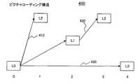 本発明の諸実施形態で利用されるコーデック300は、複数レベルの時間スケーラビリティ分解能(たとえば、L0〜L2)および他の拡張分解能(たとえば、S0〜S2)を可能にするために別々のピクチャ「スレッド」からなるセット(たとえば、3つのスレッド410〜430のセット)を生成するように構成することができる。スレッドまたは予測チェーンは、同一スレッドからのピクチャまたはより下のレベルのスレッドからのピクチャのいずれかを使用して動き補償されるピクチャのシーケンスと定義される。図4の矢印は、3つのスレッド410〜430の予測の方向、ソース、およびターゲットを示す。スレッド410〜420は、共通のソースL0を有するが、異なるターゲットおよび経路(たとえば、それぞれターゲットL2、L2、およびL0)を有する。スレッドの使用は、時間スケーラビリティの実施を可能にする。というのは、任意の個数のトップレベルスレッドを、残りのスレッドの復号処理に影響せずに除去することができるからである。 The codec 300 utilized in embodiments of the present invention is a separate picture “thread” to allow multiple levels of temporal scalability resolution (eg, L0-L2) and other extended resolutions (eg, S0-S2). Can be configured to generate a set (eg, a set of three threads 410-430). A thread or prediction chain is defined as a sequence of pictures that are motion compensated using either pictures from the same thread or pictures from lower level threads. The arrows in FIG. 4 indicate the prediction direction, source, and target of the three threads 410-430. The threads 410-420 have a common source L0 but have different targets and paths (eg, targets L2, L2, and L0, respectively). The use of threads makes it possible to implement temporal scalability. This is because an arbitrary number of top level threads can be removed without affecting the decoding process of the remaining threads.