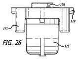 図23は、突起部174、分配ポート173、凹部領域178、ならびに、タブ176および179を備えるカートリッジ上部172の一般的な形状を例示している上方図である。図24は、上部172からのそれぞれのフランジ177によるそのウイング状の突出部182によって保持されている、投薬位置における容器175を示すカートリッジ170の下方図である。図25は、カートリッジ上部172および容器175の上方の境界上に、切り欠きにより形成された空気入口部181をさらに備える、投薬形態におけるカートリッジ170を示す。この構成では、空気入口部181はカートリッジの内部と連通しており、分配ポート173との空気導管を形成している。使用の際、カートリッジ空気入口部181は、分配ポート173において空気の流れがカートリッジ内部に入り方向付けられるよう構成されている。図26は、投薬形態における反対の端部からのカートリッジ170、または図25の背面図を示す。  FIG. 23 is an upper view illustrating the general shape of