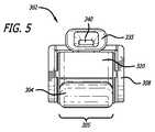 図1での使用の際において、空気の流れは空気入口部310を通って吸入器へと入り、同時に、空気入口部355を通ってカートリッジ170を通る空気導管340の中へと入っている。1つの実施の形態では、入口ポート355から出口ポート335へと延在している空気導管340でのマウスピース330の内部空間は、約0.2cm3よりも大きい。他の例示する実施の形態では、内部空間は、約0.3cm3、約0.3cm3、約0.4cm3または約0.5cm3である。別の実施の形態では、このマウスピースの内部空間は、マウスピース330の内部空間である0.2cm3より大きい。1つの実施の形態では、マウスピースの内部空間は、0.2から6.5cm3の範囲である。カートリッジ容器175内に含有された粉末は、流動化され、または粉末含有物の転動を介してカートリッジに入る空気の流れの中へと搭載される。流動化された粉末は、その後、徐々に分配ポート173、127を通りマウスピース空気導管340内へと出て、さらに、出口ポート335へ出る前に、空気入口部310において入る空気の流れで解凝集され、希釈される。In use in FIG. 1, the air flow enters the inhaler through the