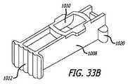 この実施の形態の1つの態様では、容器977、983は、カートリッジ上部または蓋976、982の下表面または内部表面から、容器977、983の空間または内部空間974、990の中へと延在している、1以上の突出部または幹状部を任意において有することができる。突出部またはデフレクタ978、984は、投薬形態における吸入の間に、特に容器内の下方へと流れを方向付ける、または導流することができる限り、任意の形状または大きさとすることができる。特定の実施の形態では、突出部978、984は、投薬形態において、空気入口部980、986の近位における、容器の内部空間に対向している表面975、981から延在しており、カートリッジの蓋において構成されていてもよい。代替では、突出部978、984は、容器の内部空間に接触するためのマウスピースの表面内において、および単回使用吸入器(図33C)での投薬形態における容器により形成される空気入口部に対して近位において、設計することができる。突出部またはデフレクタの長さは、容器の深さ、吸入器から送達される粉末の種類および/または粉末の量に応じて、任意の大きさにすることができる。1つの実施の形態では、突出部の長さは、容器の内部空間の深さの、1%よりも大きい、5%よりも大きい、または、10%よりも大きい。このような、および他の容器の実施の形態では、突出部またはデフレクタの長さは、容器の内部空間の95%未満である。  In one aspect of this embodiment, the