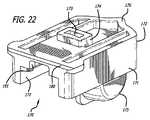 別の実施の形態としては、並進移動するカートリッジ170が、図22−30において示されている。これは、カートリッジ150の代替の実施の形態であり、例えば、図1−9において描かれた吸入器302を用いて使用することができる。図22では、上部または蓋172と内部空間を定めている容器175とを備えるエンクロージャを含むカートリッジ170が描かれている。カートリッジは、収容形態におけるものが示されている。このカートリッジの構成では、カートリッジ上部172は容器175を封止して形成するよう構成されており、容器または蓋は互いに相対的に移動可能である。カートリッジ170は、収容位置(図22および29)から投薬位置(図24−28および30)へと構成され得る。さらに、カートリッジが使用されたことを示すように、処分位置(図示せず)、例えばカートリッジの中央へと構成され得る。図22は、カートリッジ170の様々な特徴も示しており、上部172は、容器の外側を部分的に被覆するように構成されている側方パネル171を備えている。それぞれの側方パネル172は、その低い方の端部にフランジ177を備えており、フランジは、容器175のウイング状の構造を保持するように軌道を形成しており、上部172の低い方の境界に沿った容器175の移動を可能としている。カートリッジ上部172は、さらに、一端における外側の相対的に平坦な表面と、開口または分配ポート173を有している相対的に長方形の突起部174と、強固な封止において容器175の含有を維持するよう内部において構成されている窪みまたは凹部領域とを備える。1つの実施の形態では、分配ポートは様々な大きさを有するように構成され得る。例えば、開口の幅および長さは、カートリッジ内部へのその入口において、幅は約0.025cmから約0.25cm、長さは約0.125cmから約0.65cmにおいて形成することができる。1つの実施の形態では、分配ポートの入口は、大凡、幅が0.06cm、長さが0.3cmで測定される。特定の実施の形態では、カートリッジ上部172は、掌握する表面および固定メカニズムも含み得る様々な形状を備えることができる。当該表面では、例えば、タブ176、179、およびホルダ内での適切な配置のための、正しい方向におけるカートリッジの方向付けのような他の構成を挙げられる。固定メカニズムでは、例えば、対応する吸入器に対してしっかりと適合する、面取りした、または傾斜(している)縁部180が挙げられる。フランジ、突起部の外側の幾何学的形状、タブおよび様々なその他の構造は、吸入器のカートリッジの適切な配置を指し示し、容易にし、および/または必要とさせ得るキーイング表面を構成することができる。さらに、これらの構造は、カートリッジにより提供される特定の薬物または用量を、特定の吸入器と相関させるため、1つの吸入器−カートリッジの組み合せのシステムから別のものへと変えてもよい。そのような場合、第1の薬物または用量と関連している吸入器用のカートリッジは、第2の薬物または用量と関連している類似した吸入器に配置され、または処方されることを防ぐことができる。  In another embodiment, a translating