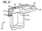 図17では、さらに、上部または蓋156、および、内部のスペースまたは空間を定めている容器151を備えるカートリッジ150が示されている。図18には、さらに、反対の端部を有し、凹部領域154およびその長手方向軸Xの反対の端部において突出部126を備えるカートリッジ上部156が例示されている。側方に沿った長手方向軸Xにおける相対的に長方形であるパネル152のセットも例示されており、これは、端部において上部156と一体的に構成されており、取り付けられている。カートリッジ上部156の境界158は下方に延在しており、パネル152と繋がっている。パネル152は長手方向軸Xにおける上部156のそれぞれの側方から下方に延在しており、長手方向の空間またはスリット157により、突起部126および凹部領域154の区域から分離している。図17−21において、フランジ153をさらに備えるそれぞれのパネル152が示されている。フランジは、容器151の突出部分またはウイング166と係合し、容器151を保持し、容器151が凹部領域154の下の収容位置から突起部126の領域の下の投薬位置へと移動できるよう構造的に構成されている。パネル152は、容器151の境界158へと取り付けられる端部を越える動作から防止するため、それぞれの端部においてストップ132を備えるように構造的に構成されている。この実施の形態では、容器151もしくは蓋156は、例えば上部156の下の併進移動により動くことが可能であり、または上部156は容器151と相対的に動くことができる。1つの実施の形態では、蓋もしくは上部156が設置されている場合、容器151は蓋156上のフランジ153において滑ることにより移動させることができ、または蓋156は、吸入器の構成に応じて、設置されている容器151上を滑ることにより移動させることができる。突起部126近くの境界158は、カートリッジの投薬形態における入口ポート119の周囲部分を形成する凹部領域を有する。  FIG. 17 further shows a