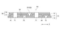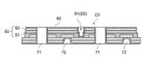 図10に示す構成では、ビルドアップ基材50の長手方向の端部は、接着材シート40の長手方向の端部よりもX方向において突出しない位置に存在している。そのため、隣り合う一体物の間に形成される隙間S1については、その隙間S1における接着材シート40同士の間隔L1は、ビルドアップ基材50同士の間の間隔L2よりも狭くなっている。それにより、隙間S1は、上面側から下面側(連続ベース材10側)に向かうにつれて、間隔が狭くなるような段形状に設けられている。以下では、この段形状の部分を、段形状部S2とする。  In the configuration shown in FIG. 10, the end portion in the longitudinal direction of the build-