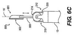 さらに、医療装置600、700、800は、図3A〜図3Bに示される突出可能および格納可能な特徴、図4A〜図4Cに示される突出可能かつ側方折畳み後退特徴、および/または図5A〜図5Cに示される後退可能なスリーブ501を含むことができる。すなわち、遠位ツール601、701、801は、図3A〜図3Bの遠位ツール11と同様に旋回部材218に対して突出および後退することができ、図4A〜図4Cの遠位ツール11と同様に旋回部材218の回転時にU字形部材17のスロットに突出および格納することができ、および/または図5A〜図5Cの遠位ツール11と同様に後退可能なスリーブ501の軸方向移動時に後退可能なスリーブ501から露出および後退可能なスリーブ501内に収容することができる。Furthermore, the