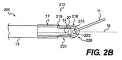上記実施形態のいずれにおいても、遠位ツール11は鋭くしても鈍くしてもよく、楕円形状、矩形形状、三角形状、または円形形状などの任意の適切な断面形状をとることができると認識すべきである。さらに、特定の実施形態では、位置決め機構212は、作動時に旋回部材218を回転させるように構成される単独の制御部材を含むことができる。位置決め機構212は、旋回部材218を所望の配向に付勢するバネなどの適切な付勢部材(図示せず)も含むことができる。たとえば、付勢部材は、遠位ツール11が長手軸16からオフセットされるように旋回部材218を付勢することができる。In any of the above embodiments, the