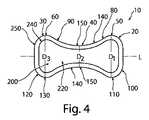図3は、図1の線3−3に沿って取られたペッサリー装置10を示す。ペッサリー装置10は、上部20、下部30、中部40、上部20の圧力領域50、下部30の圧力領域60、最大直径D1、最小直径D2、上部20から中部40へ延びる傾斜部80、中部40から下部30への傾斜部90、及び長手方向軸(L)を含む。図3に示されるように、ペッサリー装置10は、凸部110を含む頂部100、凸部130を含む底部120、凹部150を含む側部140を有することができる。図3に示されるように、ペッサリー装置10は、外壁250と、内壁240によって画定され、領域220で中空である内部200とを有することができる。中空領域220を、一方の端部又は両方の端部に提供されることができる。更に、ペッサリー装置10は、中実である内部200の部分を有することができる。FIG. 3 shows the