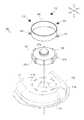 下板142は、略円形板状に形成されるものである。下板142の直径は、上板141の直径よりも小さくなるように形成される。下板142は、上板141と平行(略水平)に配置される。下板142は、上板141から所定距離だけ離間した状態で、上板141の下方に配置される。下板142は、当該下板142の軸線が、上板141の軸線と一致するように配置される。下板142には、中心孔142a及びリブ142bが形成される。  The