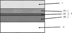 以下では、図1に示すウエハ加工体、即ち、仮接着層をウエハ側から仮接着層(C)、(A)、(B)の順で形成した構造を中心に説明するが、本発明のウエハ加工体は、図1に示す(C)層がウエハ1側に、(B)層が支持体3側に配置された構造に限定されるものではない。さらに、その他の層を形成し備えていても良い。  Hereinafter, the wafer processed body shown in FIG. 1, that is, a structure in which the temporary adhesive layer is formed in the order of the temporary adhesive layers (C), (A), and (B) from the wafer side will be mainly described. The wafer processed body is not limited to the structure shown in FIG. 1 in which the (C) layer is disposed on the wafer 1 side and the (B) layer is disposed on the