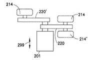 移送アーム214は、ショルダ軸SXでベースアームリンク220に回転可能に取り付けられ得る。理解されるように、また図2Dに示すように、移送アームは、ベースアームリンク220の水平面のいずれかに取り付けることができる(例えば、上面および/または底面、ここで「上面」および「底面」という語は、移送アームが、移送チャンバTCの上面TCTに取り付けられているか、または底面TCBに取り付けられているかに依存する、相対的な用語である、図2G参照)。例示のみを目的として、図2Dでは、移送アーム214はベースアームリンク220の上面に取り付けられて示されている一方で、移送アーム214’は、ベースアームリンク220の底面に取り付けられて示されている。移送アーム214、214’のいずれか一方、または移送アーム214、214’の両方が、ベースアームリンク220に取り付けられ得ることに留意する。理解されるように、2つの移送アームが同一のベースアームリンクに取り付けられる場合、駆動セクション200は、ベースアームリンク220を回転させるための単一の駆動軸と、2つの移送アームそれぞれのための2つの駆動軸とを含んでいてもよく、各移送アームの移送アームリンクは、後述のものと実質的の同様の態様で、それぞれの駆動軸に接続される(例えば、適切な数の駆動シャフトおよび伝動装置が、1つのベースアームリンク上で2つの移送アームを駆動させるための、同軸駆動シャフト機構に加えられている場合)。他の態様において、移送アームは、任意の適切な数の駆動軸によって駆動されてもよい。複数の移送ロボットが、後述のものと実質的の同様の様態で、単一の移送チャンバ内に設けられてもよい。理解されるように、2つまたは3つ以上の移送アーム(および/または、2つまたは3つ以上の移送ロボット、図2G、2F、13、14および15〜18参照)が移送チャンバに位置付けられる場合、移送アーム/ロボット用の制御装置、例えば、制御装置120は、1つのアーム/ロボットの動作が別のアーム/ロボットの1つの動作と干渉しないように、移送アーム/ロボットを動作させるように構成され得る。  The