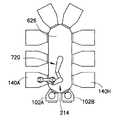 次に図13Aを参照すると、処理装置の一部が示されている。図からわかるように、移送チャンバ1125は、処理モジュール、ロードロックまたは他の任意の適切な基板処理装置を移送チャンバ1125に連結するために、閉鎖可能なポート1196A〜1196Hを有する。この態様において、移送チャンバ1125なの移送装置1199は、ハブ型の移送装置であってもよい。例えば、回転ハブ1199Hは、移送チャンバ1125内の任意の適切な場所に配置され得る。ハブ1199Hは、任意の適切な駆動部によって任意の適切な方法で回転可能に駆動され得る。この態様においてハブ1199Hは、4つのハブ連結部1199Cを有するものとして示されているが、別の態様において、ハブは任意の適切な数のハブ連結部を有し得る。ハブスペーサリンク1198(これは上述のスペーサリンク722Sと実質的に同じであってもよい)は、ハブ連結部1199Cのそれぞれに連結され得る。ハブスペーサリンク1198の一端は、ハブ連結部1199Cに連結され、ハブスペーサリンク1198の他端は、任意の適切な移送アーム214A、214B(これは本明細書に記載する移送アームと実質的に同じであってもよい)が取り付けられるモータモジュール201Mに連結され得る。ハブ1199Hは、一組のポートから別の組のポートへ移送アーム214A、214Bを移動させるために、矢印1197の方向に回転可能に指標付けでき、この態様において、ポートの組は、移送チャンバ1125の角に配置されている。所望のポートに位置付けられる移送アーム214A、214Bは、移送チャンバ1125へ、および移送チャンバ1125から基板を移送するために、モータモジュール201Mによって延伸および後退され得る。別の態様において、移送アーム214A、214Bは、単一のポートにアクセスするように配置され得る。一態様において基板保持ステーション1199Sは、ハブ1199H上に配置され得る。基板保持ステーション1199Sは、バッファー、アライナ、または他の任意の適切なウェハ保持ステーションであってもよい。基板保持ステーションは、移送アーム214A、214B間でのウェハの移送を可能にし得る。  Referring now to FIG. 13A, a portion of the processing device is shown. As can be seen, the
