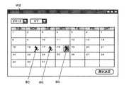 例えば、データ解析装置70は、図6に示すようなカレンダー型一覧表示画面W2によって、カレンダーにマーク80等を付与することで、その日に計測された計測データが保存されていて解析対象として選択可能であることをユーザーに示すことができる。このカレンダー型一覧表示画面W2では、ユーザーが解析対象としたい計測データのマーク80を選択することができる。そして選択決定操作をすれば選択した解析対象の計測データに基づくグラフ表示画面とマップ表示画面とがタッチパネル52に新たに表示される。  For example, the