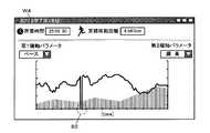 図7は、グラフ表示画面の例を示している。本実施形態のグラフ表示画面W4では、ランニングの所要時間や累積移動距離とともにグラフが表示される。本実施形態のグラフは、横軸を共通とする第1縦軸(左縦軸)と第2縦軸(右縦軸)とを有する。横軸は経過時間に固定されている。第1縦軸及び第2縦軸のパラメータはユーザーが変更することができる。図7の例では、第1縦軸が「ペース」、第2縦軸が「標高」にそれぞれ設定されているが、その他の選択可能なパラメータとしては例えば、ピッチ、平均消費カロリー、ストライドなどを適宜設定することができる。また、縦軸のスケールは自動調整される。このとき、平均値や中央値との差が一定以上大きい値は、スケール自動調整の対象外とされる。図7の例では、第1縦軸の「ペース」が他のデータに比べて極端に数値が低いデータ(符合82付近のデータ)がある。図7の例は、ランニング中に交通信号や危険回避のために一時的に止まらざるを得なかった地点のデータであるが、第1縦軸のスケーリングはそうした極端に数値が低いデータ(または、高いデータ)をスケーリング自動調整として含め無いので、グラフ表示範囲外となる。 FIG. 7 shows an example of a graph display screen. In the graph display screen W4 of the present embodiment, a graph is displayed together with the time required for running and the cumulative movement distance. The graph of the present embodiment has a first vertical axis (left vertical axis) and a second vertical axis (right vertical axis) having a common horizontal axis. The horizontal axis is fixed to the elapsed time. The parameters of the first vertical axis and the second vertical axis can be changed by the user. In the example of FIG. 7, the first vertical axis is set to “pace” and the second vertical axis is set to “elevation”, but other selectable parameters include, for example, pitch, average calorie consumption, stride, and the like. It can be set appropriately. The scale of the vertical axis is automatically adjusted. At this time, a value whose difference from the average value or the median is larger than a certain value is excluded from the automatic scale adjustment. In the example of FIG. 7, there is data whose “pace” on the first vertical axis is extremely lower than other data (data near the sign 82). The example in FIG. 7 is data at a point where it was necessary to temporarily stop for traffic signals or avoiding danger during running, but the scaling of the first vertical axis is such extremely low data (or High data) is not included in the automatic scaling adjustment, so it is outside the graph display range.