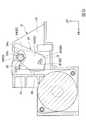 次に、レバー90の一端部90aをさらに押し下げ、ロックアーム61の第2連結部68を上方に向かってさらに押し上げる。このときロックアーム61は、中心軸Q周りに回動可能なため、抱え込み部64が後方へ移動するように回動する。すると、図9に示すように、基部63の上端面63aが後方斜め上に向かって移動し、ローラ挿入溝35に挿入された軸受54に接触する。  Next, the one
