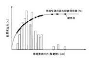 ここで、単一の原動機を有する車両の場合は、各時刻における車両要求出力に合わせて出力する必要があるため、各車両要求出力における車両全体の最大総合効率となるように原動機の動作点を決定することでエネルギー消費を最小化できる。例えば、図6に示すように、各車両要求出力について、当該車両要求出力における車速の頻度分布と当該車両要求出力とに基づいて、その時点で車両全体の最大総合効率となるように、当該車両要求出力における動作点を決定することができる。 Here, in the case of a vehicle having a single prime mover, it is necessary to output in accordance with the vehicle required output at each time, so the operating point of the prime mover is set so as to achieve the maximum overall efficiency of the entire vehicle at each vehicle required output. By deciding, energy consumption can be minimized. For example, as shown in FIG. 6, for each vehicle request output, the vehicle is configured so that the maximum overall efficiency of the entire vehicle at that time is based on the vehicle speed frequency distribution in the vehicle request output and the vehicle request output. The operating point at the required output can be determined.