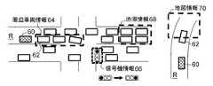 地図情報としては、自車両が向かう先に存在する走行に影響する要素(たとえば、信号機、カーブ等)に関する情報が挙げられる。この情報は固定された静的情報なので確定的である。収集した上記各交通環境情報は、RAM等の記憶手段に一時的に記憶させてもよい。 As map information, the information regarding the elements (for example, a traffic signal, a curve, etc.) which influence the driving | running | working which exists ahead of the own vehicle is mentioned. This information is definitive because it is fixed static information. The collected traffic environment information may be temporarily stored in storage means such as a RAM.
