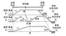 これから通過する信号機が現在青であるとし、赤に変わるまでの時間をtsとする(信号機情報により確定的にわかるとする)。自車両が自動運転車の場合は、今後の自車の速度パターンがわかるため、信号機を通過するまでの理想的な時間tiとtsを比較してti<tsならば青信号のまま通過できることがわかる。しかし、実際は、周辺車両情報の影響、及び渋滞情報の影響を受けるため、確率的に判定する必要がある。It is assumed that the traffic light passing through now is blue, and the time until it turns red is ts (assuming that it is definite by the traffic signal information). If the vehicle is automatically driven vehicle, since it is apparent speed pattern future vehicle, remain ti <ts If blue signal by comparing the ideal time ti and ts until the pass the traffic You can see that you can pass. However, since it is actually influenced by surrounding vehicle information and traffic jam information, it must be determined probabilistically.