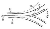 図4aは、肺の気管支通路202の変形されていないモデル200を例示している。カテーテル204が、気管支通路202内に延びている。カテーテル204は、器具120と実質的に類似し得る。モデル200は、表示システム上に表示されてもよく、又は、コンピュータメモリにおいて表示されない形で存在してもよい。示されているように、カテーテル204は、気管支通路202に対して変形力Fを及ぼす。図4bは、モデル160に対する変形力Fの効果を例示している。カテーテル204の力Fは、角度θで気管支通路202を動かす。変形されたモデル206は、気管支通路202の位置及び方向に対するカテーテル164の力の効果を例示している。  FIG. 4 a illustrates an