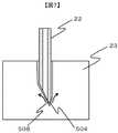 また、本発明のCTSノズル22の先端には、前述の通り先端側テーパ部504があり、先端ストレート部502の先端を、切断面508と先端側テーパ部504の切削面を夫々斜めに削ることで、CTSノズル22の先端部506は鋭利となっている((b)参照)。切断面508は、開口部507を楕円状とする切断面である。切断面508は、中空部が配置された管の端部に備えられ、開口部507を取り囲む平面を有するカット面(第1の面)である。また、先端側テーパ部504は、このカット面の反対側に備えられたテーパ部(第2の面)である。そして、先端部506は、切断面508(第1の面)と先端側テーパ部504(第2の面)の交線で形成されている先端部である。なお、符号508は特に管を切断する面であるため切断面と称しているが切削面と同義であり単に切削面と言う場合もある。  Further, as described above, the tip
