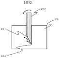 また望ましくは、曲面を切削する工程は、根元側ストレート部501よりも外径の小さい先端側ストレート部502と、これらの間の根元側テーパ部503とを形成する工程を含み、この曲面を切削する工程は、先端側ストレート部502の先端を切削する工程を含む。また望ましくは、前述のように切断面の淵の部分を丸める加工(例えばブラスト研磨など)を行うことが好ましいため、中空部を取り囲む面と中空部で挟まれた管の鋭角部を丸める工程を含む。  Desirably, the step of cutting the curved surface includes a step of forming a tip-side