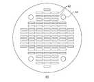 次に、イオン照射に用いるマスク40について述べる。図7は、イオン照射に用いるマスク40を模式的に示す上面図である。マスク40は、ウェハ24の照射面を覆うことのできる大きさを有する円盤形状の部材である。マスク40は、アルミニウム(Al)、ステンレス鋼(SUS)、ニッケル(Ni)、タングステン(W)、モリブデン(Mo)、チタン(Ti)およびこれらの合金を含む金属や、シリコン(Si)、その他樹脂などで構成される。マスク40は、照射されるイオンを通過させるための開口42と、位置合わせ用に設けられるアライメント開口44を有する。(Ion irradiation mask)
