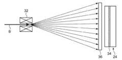 図3は、イオンビームの照射イメージを模式的に示した図である。加速器12から出射したイオンビームBは、マグネット32の働きによりその方向が変化する。そして、イオンビームBでウェハ24の表面を順次走査することで、ウェハ24の所定の領域にイオン照射が行われ、欠陥層34が形成される。なお、ウェハ24の照射面の前方には、イオンビームの加速エネルギーを調整するために、アルミ製のアブソーバ36が配設されている。アブソーバ36は、例えばアルミホイル等の金属箔が用いられる。  FIG. 3 is a diagram schematically showing an ion beam irradiation image. The direction of the ion beam B emitted from the
