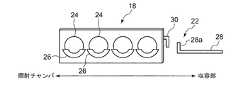 図2は、搬送プレートの一例を示す図である。搬送プレート18は、複数のウェハ24を搭載する搭載部26を有する。ウェハ24は、搭載部26に搭載された状態で所定の位置に保持される。移動機構22は、一つの搬送プレート18に搭載されている全てのウェハ24に順次イオンビームが照射され、イオン照射処理が終了すると、搬送用軸28の端部28aを搬送プレート18の端部に設けられている被係合部30に係合させ、搬送プレート18を収容部に戻す。そして、次の搬送プレート18を照射チャンバ20へ移動する。  FIG. 2 is a diagram illustrating an example of the transport plate. The