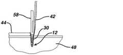 図1は、本発明による、結び目のない縫合糸アンカー10を示す。縫合糸アンカー10は、尖った遠位先端部14と近位方向に延びる延長部16とを有する遠位アンカー本体12を含む。延長部16は、ドライバーツール(図1に示さず)と係合するための、例えば六角形などの形と、縫合糸(これも図1に示さず)を受容するための縫合糸開口18を内部に有する。ガイドワイヤ20は、アンカー本体12から近位方向に延び、摩擦又はねじ切りなどによりアンカー本体12に解放可能に接続している。本体12上のねじ山22は、本体12を骨内に差し込むことを可能にする。あるいは、遠位アンカー本体12は突き錐のように骨内に推進されてもよく、その場合、ねじ山22は、除去のために使用されてもよく、又は全体が省略されてもよい。例えばRaynham,MAのDePuy  Mitek,Inc.から入手可能なCHIA  PERC通し具(登録商標)のような縫合糸通し具24が、縫合糸開口18内に配置されている。縫合糸通し具24は細長い編成NITINOLワイヤ26を含み、前記ワイヤ26は、凧形状の遠位縫合糸捕捉ループ28を有する。  FIG. 1 shows a