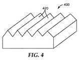 加工構造420が、図3cのプリズム形状である場合、ピラミッドは、90度のピーク角度(又はプリズムの2つのファセット間の角度)を有してもよい。プリズム形状の構造420が二等辺三角形で示される場合、次いで、フィルムの平面との2つのファセットの交点の角度は、45度の角度であろう。他の実施形態において、ピーク角度は、90度を超える、又はそれ未満であってもよい。例えば、ピーク角度は、90度〜100度、又は80度〜90度であってもよい。  If the